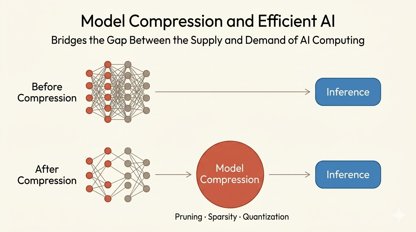 Efficient AI starts from a systems mismatch: modern models are scaling much faster than hardware memory and bandwidth. This lecture frames hardware-software co-design as the way to close that gap, combining compression algorithms with architectures that can actually exploit sparsity and low precision.