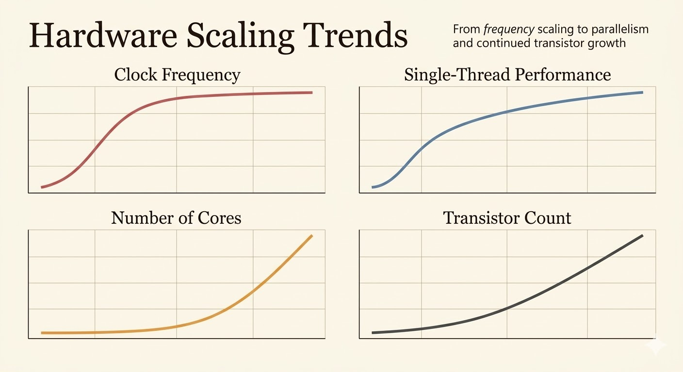 Classical single-core scaling has slowed. Clock frequency has largely plateaued, and raw transistor scaling no longer translates into easy per-core performance gains.