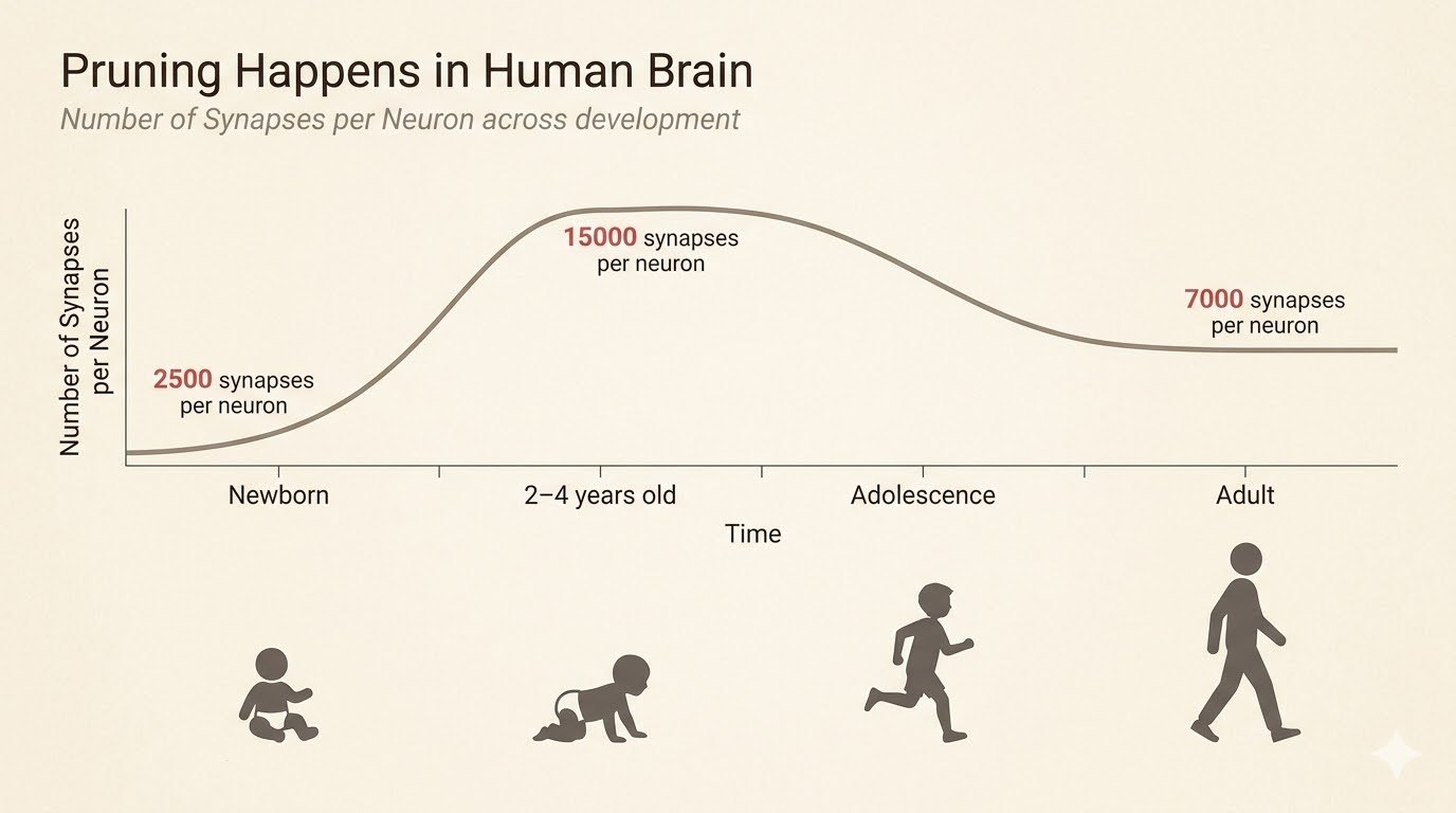 The biological analogy is synaptic pruning in the brain: connections are overproduced early, then many are removed later while function improves or stays strong.