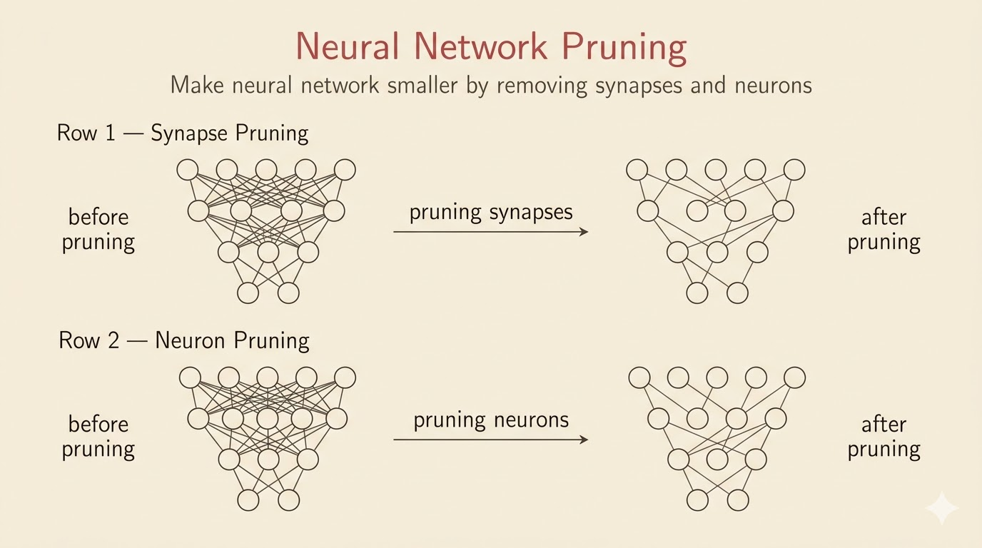 - Optimal Brain Damage (1989): one of the earliest principled pruning methods, using second-order information to decide which weights matter least