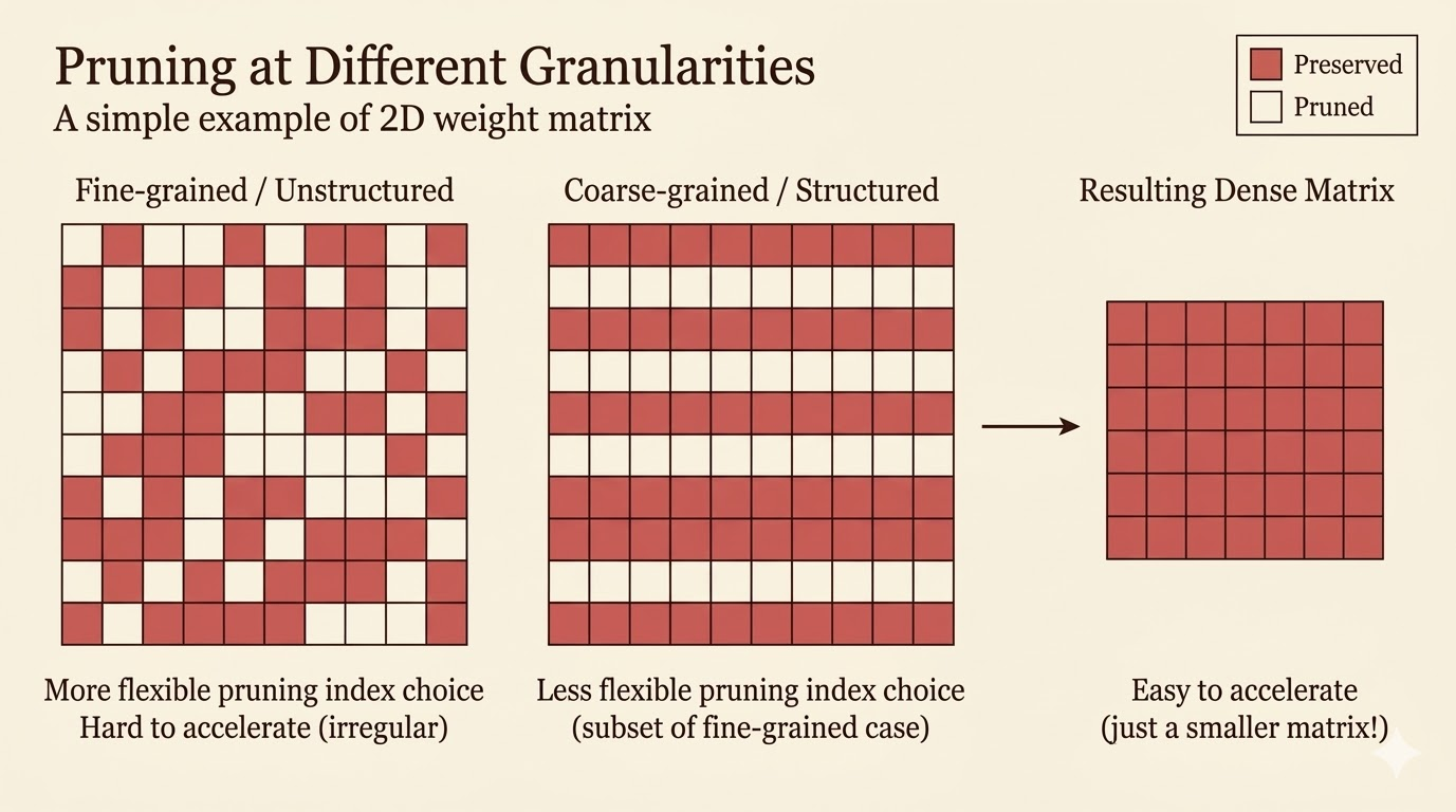 - Unstructured sparsity is flexible but hardware-unfriendly; structured sparsity is easier to accelerate.