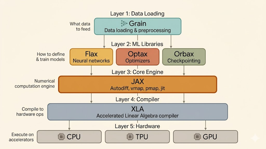 Grain: data loadingFlax NNX: neural-network structureOptax: optimizers and gradient transformationsOrbax: checkpointingJAX: function transformations and NumPy-like APIsXLA: compiler backend