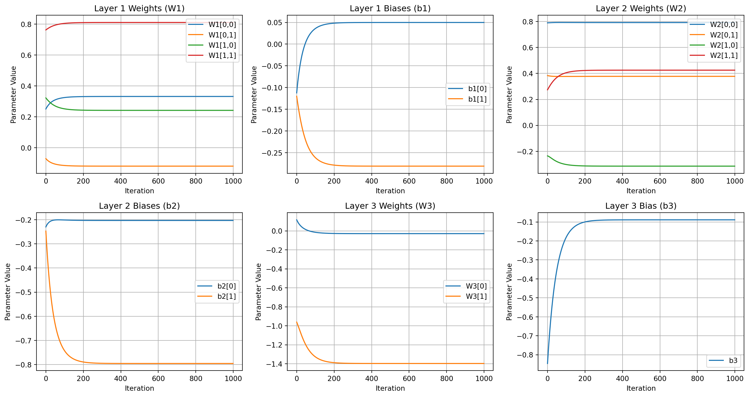 Let's implement a complete 3-layer network with backpropagation and watch how the parameters evolve during training.