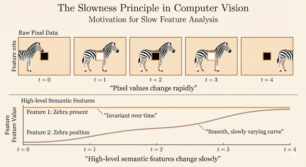 For example, in a computer vision setting, individual pixel values may change rapidly over time. If a zebra moves from left to right across an image, pixels at fixed locations may quickly switch from white to black and back again. However, higher-level semantic properties, such as whether the image contains a zebra, remain invariant, while other properties, such as the position of the zebra, tend to change much more slowly.