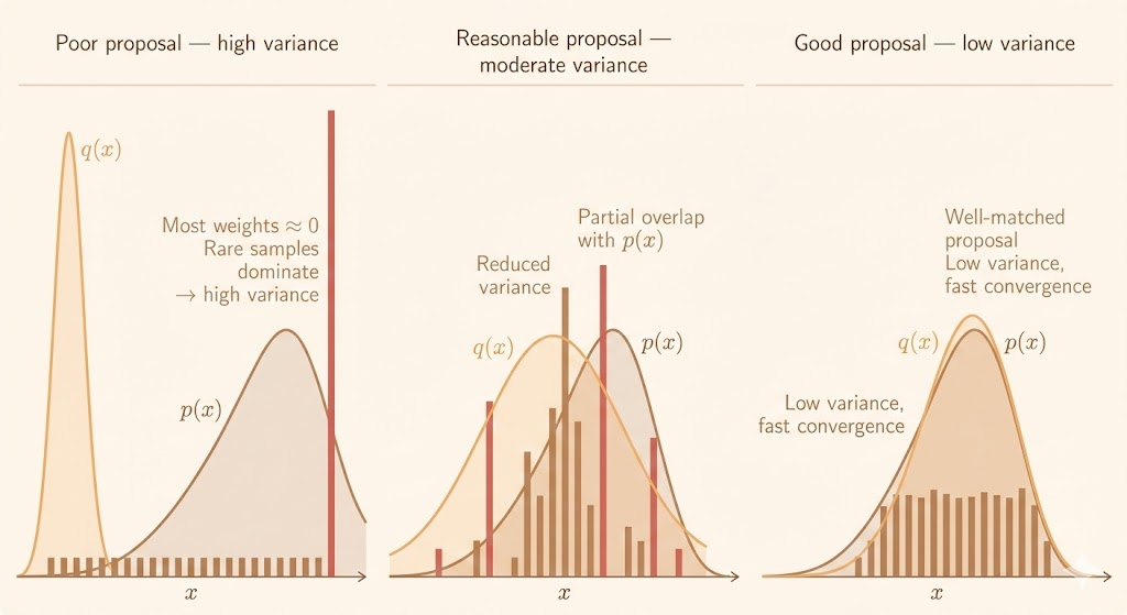 When sampling directly from \(p(x)\) is difficult, importance sampling draws samples from a proposal \(q(x)\) and reweights them: \[ \mathbb{E}_p[f(x)] = \mathbb{E}_q\left[f(x) \frac{p(x)}{q(x)}\right]. \] The proposal \(q(x)\) should be easy to sample from and should cover the support of \(p(x)\). If \(q\) puts too little mass where \(p\) is large, the weights explode and variance becomes unstable.