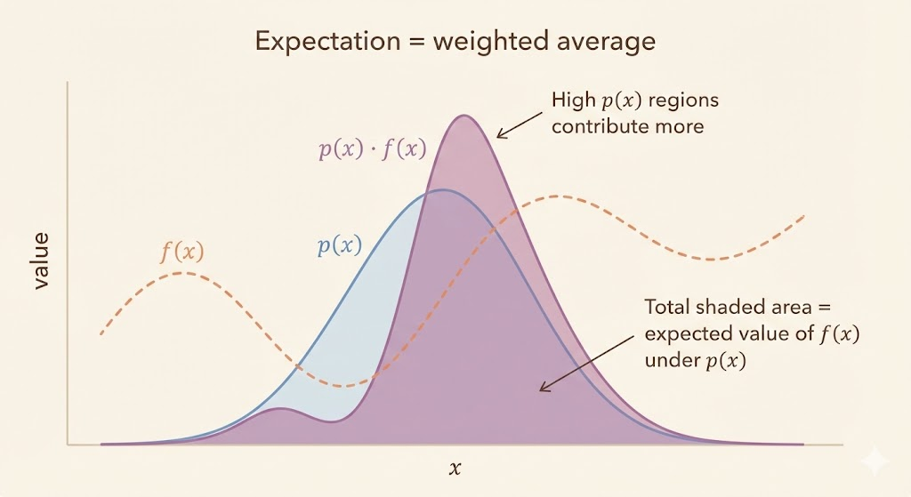 A generic expectation can be written as \[ s = \sum_x p(x) f(x) = \mathbb{E}_p[f(x)] \quad \text{or} \quad s = \int p(x) f(x) \, dx. \]
