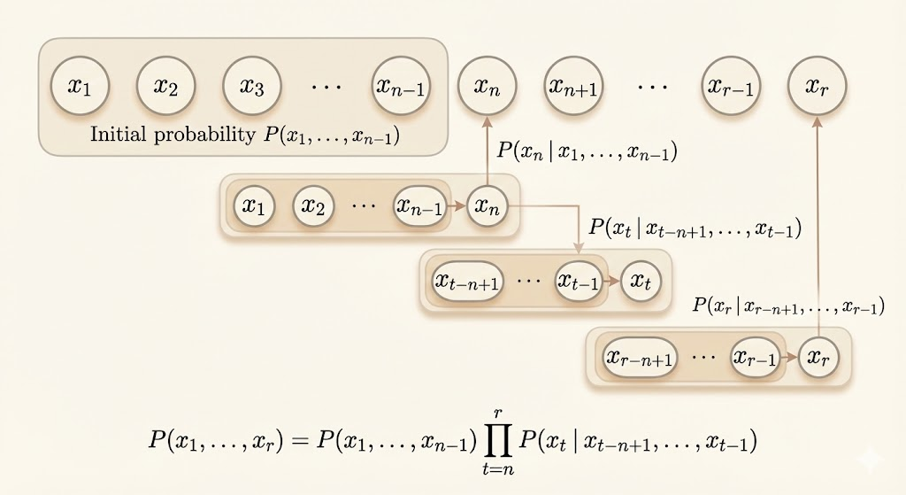 \[ P(x_1,\dots,x_\tau)=P(x_1,\dots,x_{n-1})\prod_{t=n}^\tau P(x_t|x_{t-n+1},\dots,x_{t-1}) \]
