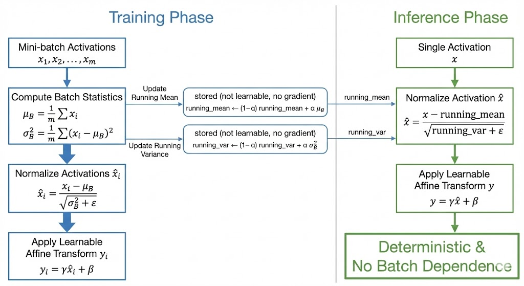 \[ \mu_{\text{run}} \leftarrow \rho\,\mu_{\text{run}} + (1-\rho)\,\mu_{\mathcal{B}},\quad \sigma^2_{\text{run}} \leftarrow \rho\,\sigma^2_{\text{run}} + (1-\rho)\,\sigma^2_{\mathcal{B}} \]