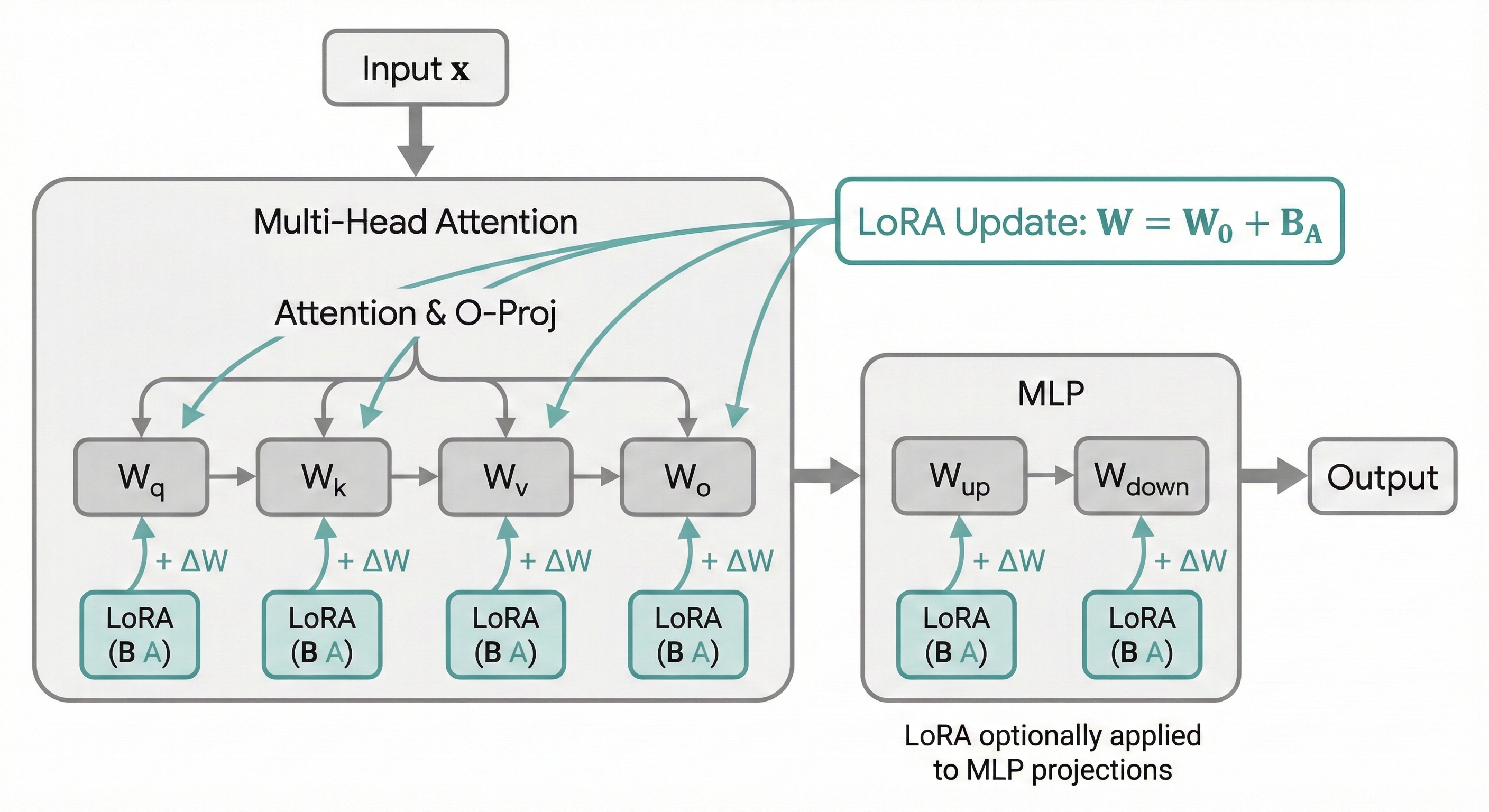 LoRA is typically applied to attention projections (e.g., \(W_q, W_k, W_v, W_o\)) and sometimes to MLP layers. You choose which matrices get low‑rank updates and the rank \(r\).