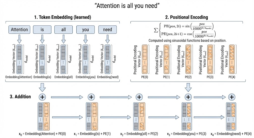 Since the Transformer operates entirely on vector representations, token embeddings are the basic units processed by the model. However, unlike recurrent or convolutional architectures, the Transformer itself has no inherent notion of token order. To inject order information, positional encoding is added to each token embedding. The positional encoding has the same dimensionality as the token embedding, so they can be combined by element-wise addition before entering subsequent Transformer layers.
