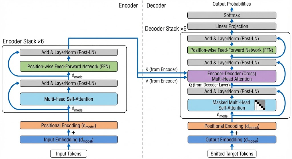 Each sublayer is wrapped by residual connection followed by layer normalization: \[ \text{LayerNorm}(x + \text{Sublayer}(x)). \]