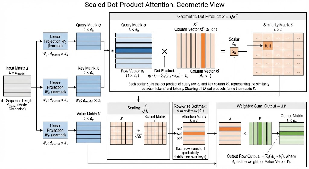 Step 2: Scale \[ S=\frac{QK^\top}{\sqrt{d_k}}. \] Scaling prevents dot products from becoming too large and saturating softmax.