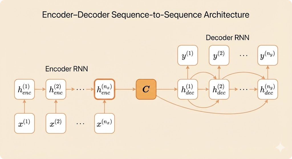 The encoder RNN reads the entire input sequence \[x^{(1)}, x^{(2)}, \dots, x^{(n_x)},\] and gradually compresses all information into a fixed-dimensional context vector: \[C = \text{Encoder}(x^{(1:n_x)}).\] This context vector represents the input sequence as a single summary embedding.