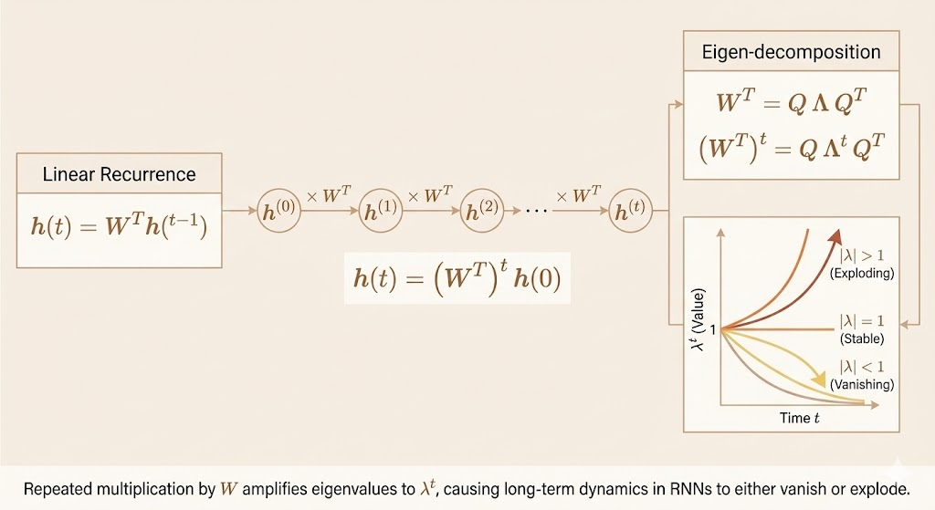 Hidden state after \(t\) steps can be written as the repeated application of the same linear transformation: