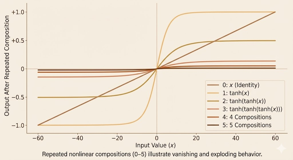 The figure shows how repeatedly applying the same nonlinear function causes saturation or steep amplification. Although the x-axis is not time, these compositions mirror the effect of many RNN time steps, explaining why gradients vanish or explode during long-term dependency learning.