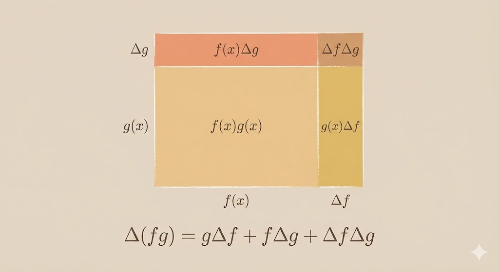 So \[ \Delta p=f\,\Delta g+g\,\Delta f+\Delta f\,\Delta g. \] Divide by \(\Delta x\): \[ \frac{\Delta p}{\Delta x}=f\frac{\Delta g}{\Delta x}+g\frac{\Delta f}{\Delta x}+\Delta g\left(\frac{\Delta f}{\Delta x}\right). \] As \(\Delta x\to 0\), we have \(\Delta g\to 0\), so the last term vanishes. Therefore: \[ \frac{dp}{dx}=f(x)g'(x)+g(x)f'(x). \]