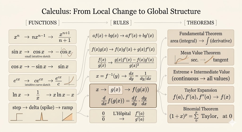 This lecture compresses a large part of first-year calculus into three lists: six basic functions, six differentiation rules, and six central theorems. It works as a compact map of the subject.