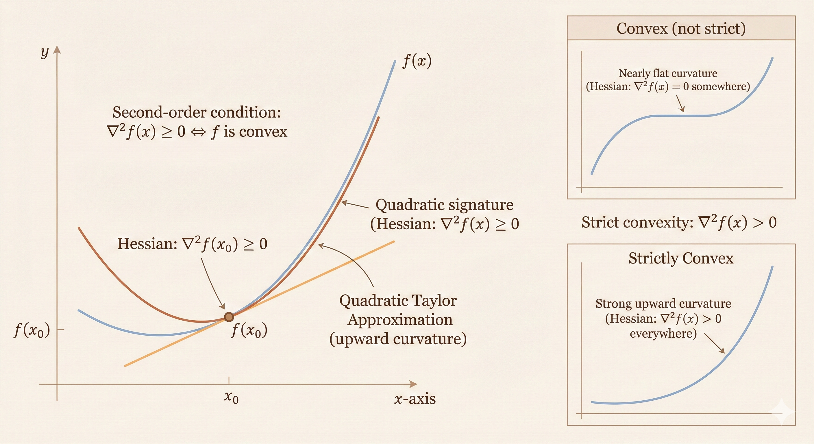 Second-order conditions: For twice differentiable \(f\) with convex domain: