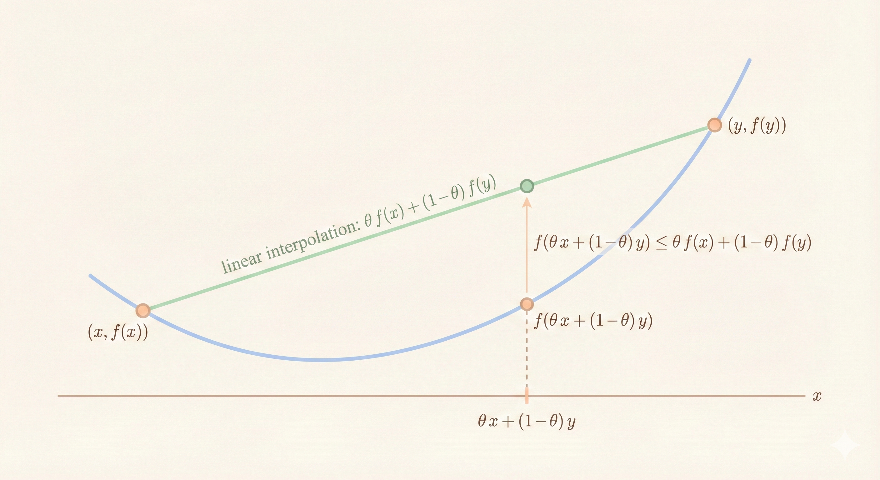 - For \(x, y \in \text{dom } f\): \(f(x)\) is convex, and \(\theta x + (1-\theta)y \in \text{dom } f\) (domain of convex function is convex)