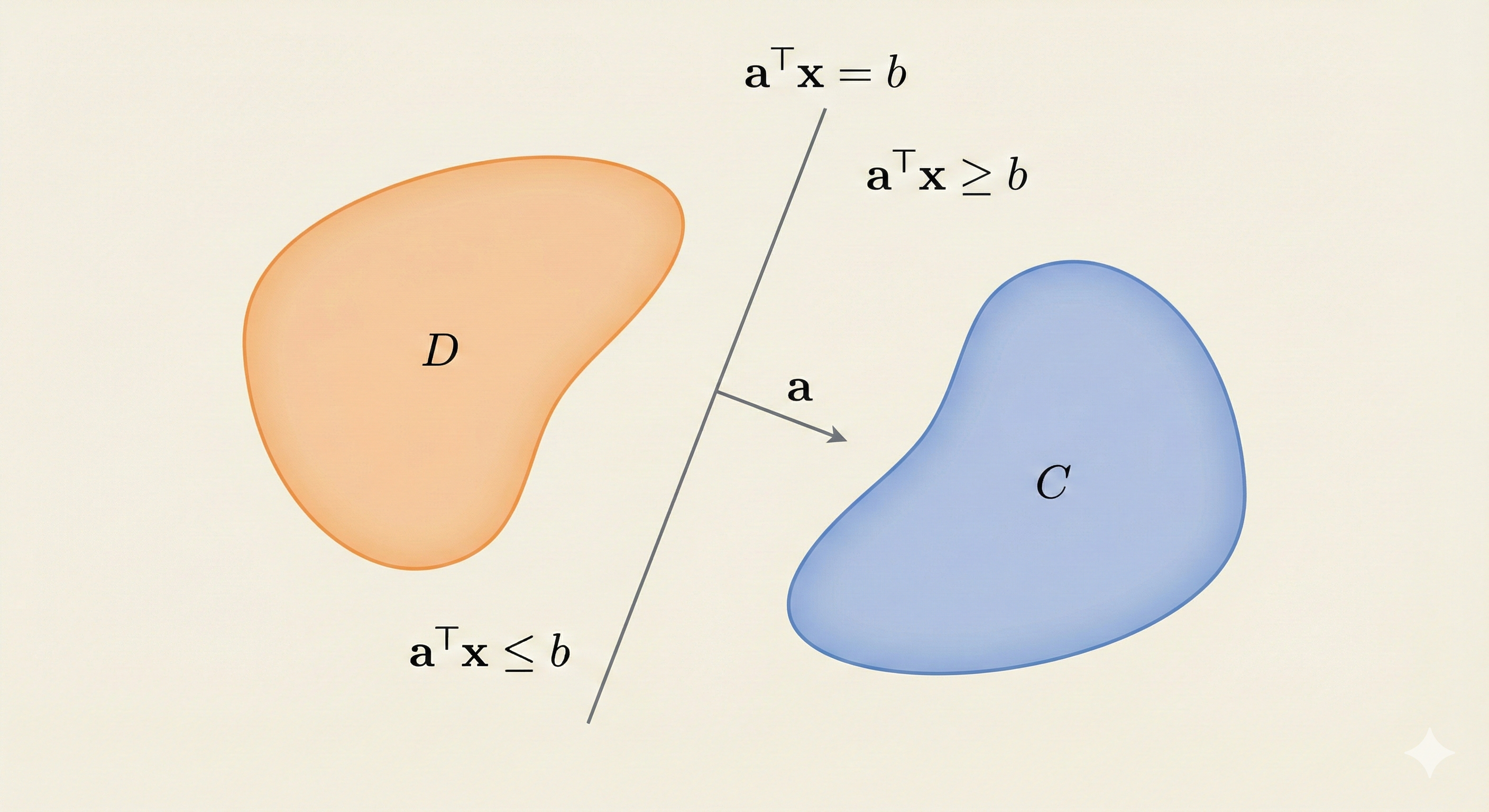\[ a^\top x \leq b \quad \text{for } x \in C, \quad a^\top x \geq b \quad \text{for } x \in D \]