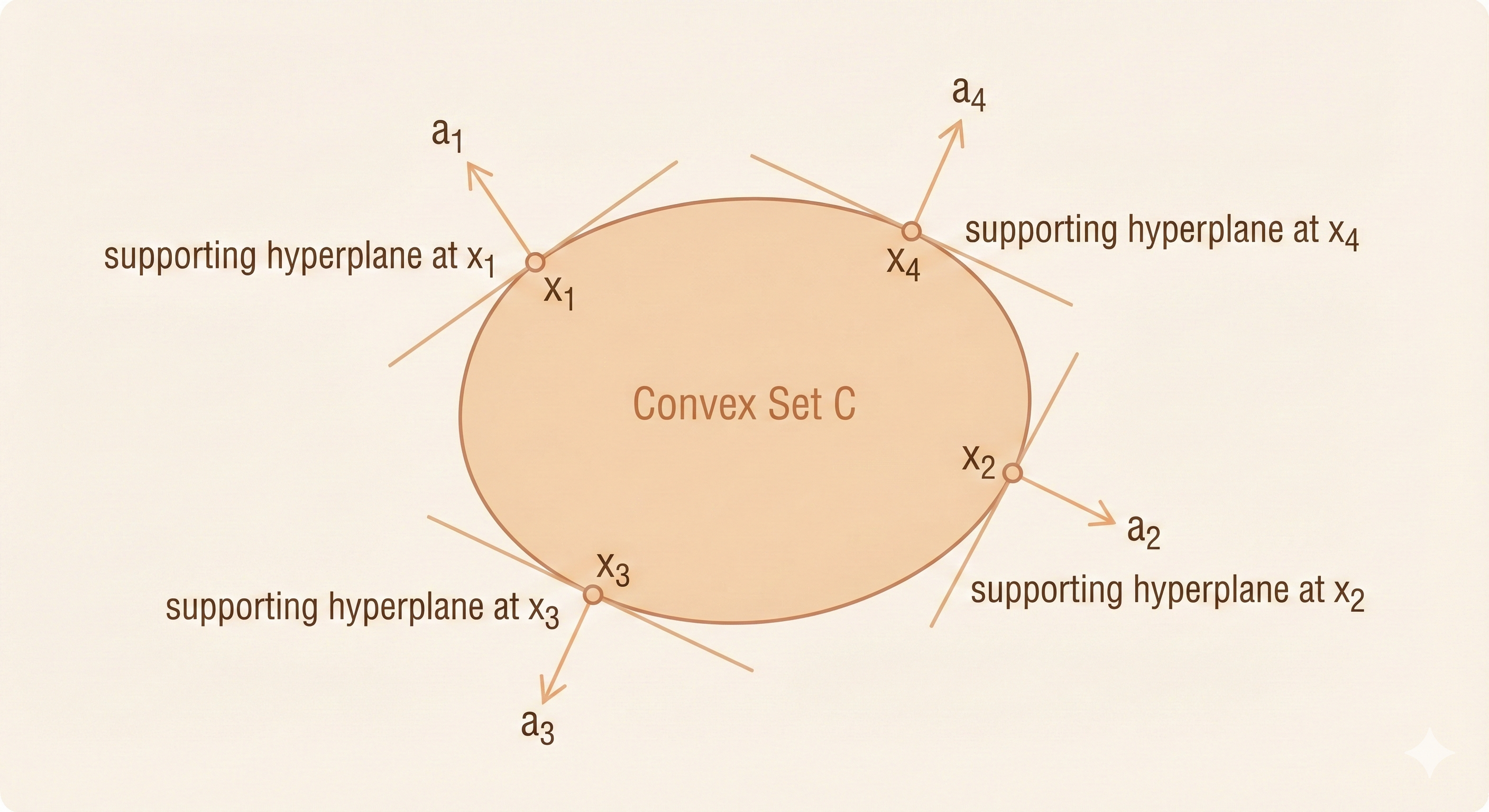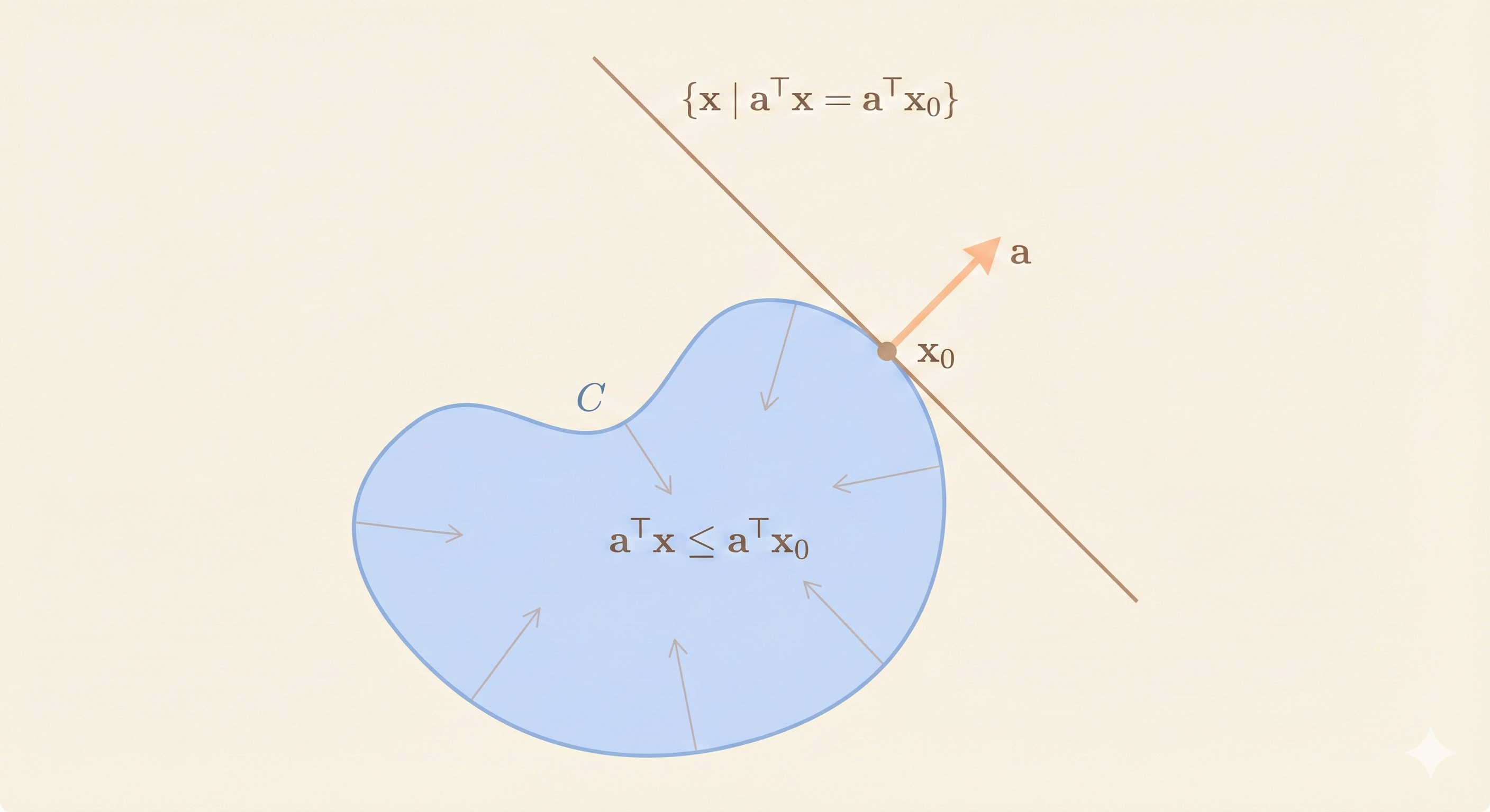 Supporting hyperplane to set C (doesn’t have to be a convex set) at boundary point \(x_0\):