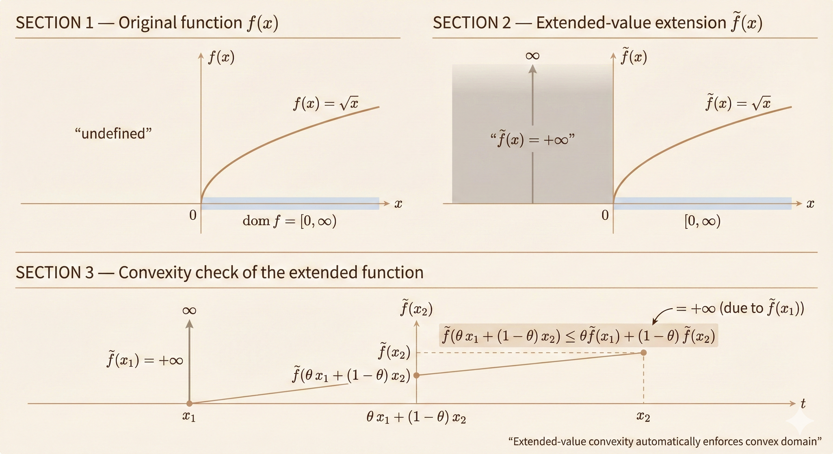 - For \(x \notin \text{dom } f\) or \(y \notin \text{dom } f\): \(\tilde{f}(\theta x + (1-\theta)y) \leq +\infty\)