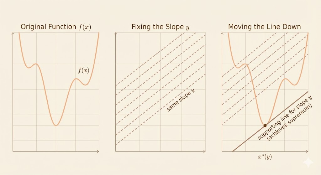 Key property: The conjugate function \(f^*(y)\) is always convex, even if \(f(x)\) is not convex.