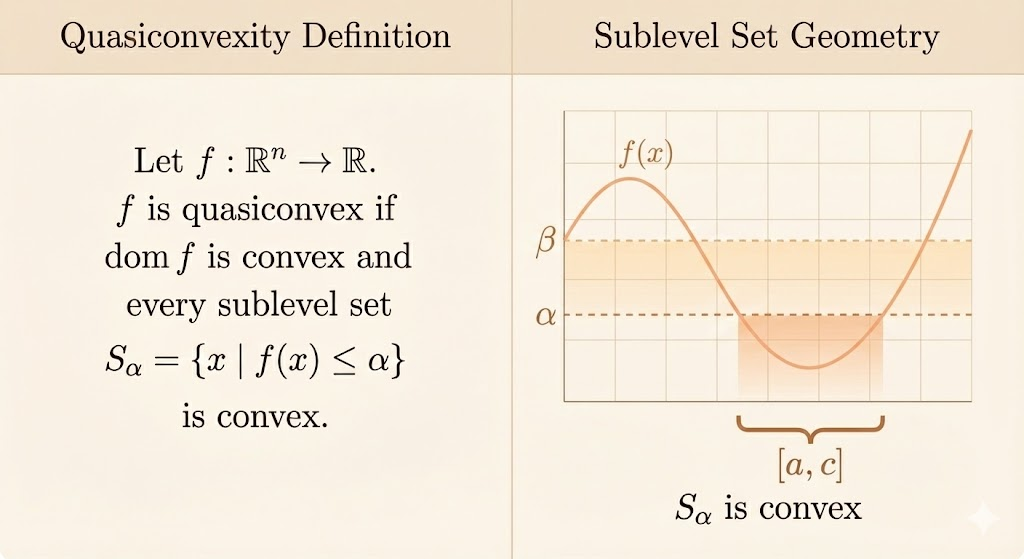 Related definitions: - \(f\) is quasiconcave if \(-f\) is quasiconvex - \(f\) is quasilinear if it is both quasiconvex and quasiconcave