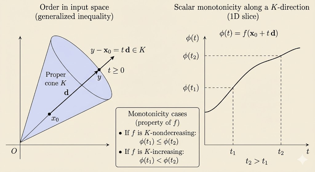 Suppose \(K \subseteq \mathbb{R}^n\) is a proper cone with associated generalized inequality \(\preceq_K\). A function \(f:\mathbb{R}^n \to \mathbb{R}\) is called K-nondecreasing if: