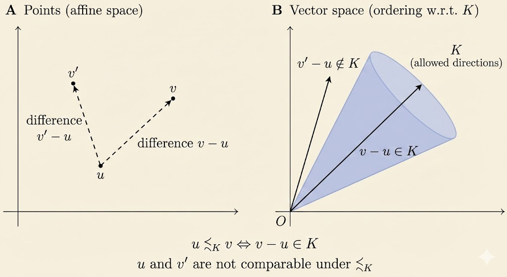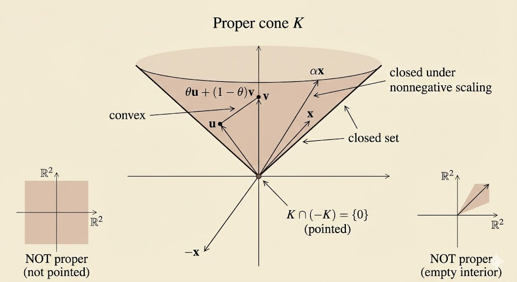 - Cone: \(x \in K,\ \alpha \ge 0 \Rightarrow \alpha x \in K\)