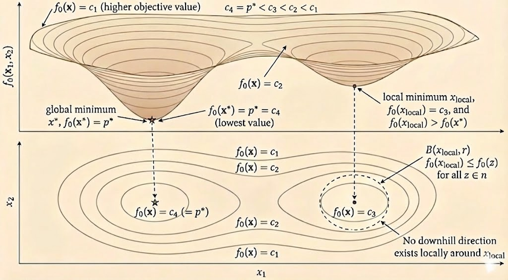 - Objective function (or cost function): \(f_0: \mathbb{R}^n \to \mathbb{R}\) — the function we want to minimize