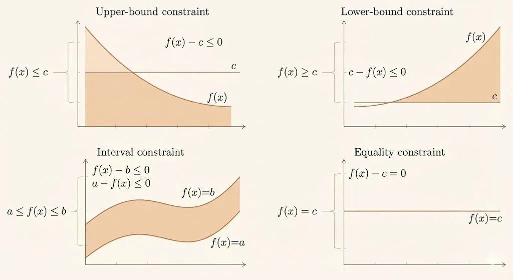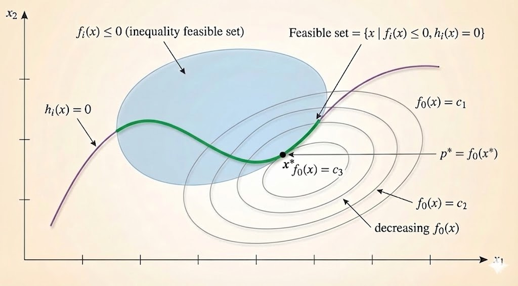 - Equality constraints: \(h_i: \mathbb{R}^n \to \mathbb{R}, \quad i=1,...,p\)