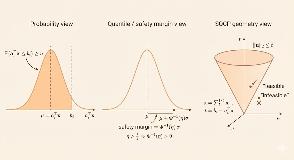 A chance constraint \[ \mathrm{prob}(a_i^\top x \le b_i) \ge \eta \] reduces to the SOCP \[ \bar{a}_i^\top x + \Phi^{-1}(\eta)\|\Sigma_i^{1/2} x\|_2 \le b_i, \] for \(\eta \ge 1/2\).