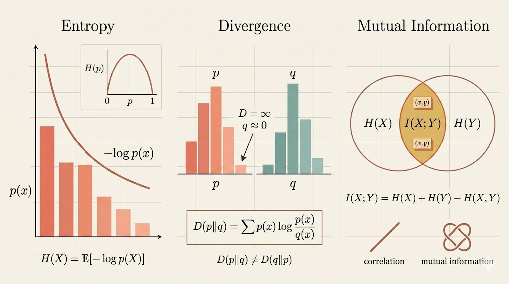 The lecture’s central idea is that these are not separate formulas. They are one family of quantities built from the same logarithmic view of probability: probability tells us what happens, and information theory tells us how surprising, uncertain, or informative those probabilities are.