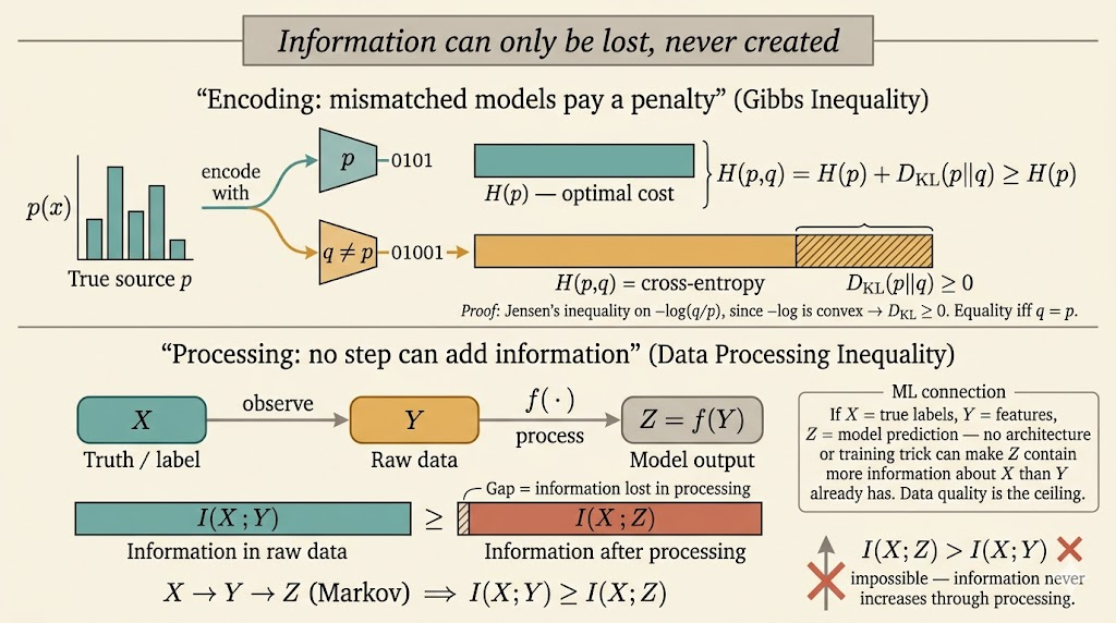 - KL-based objectives and entropy inequalities explain why likelihood, cross-entropy, compression, and distribution matching are all tightly connected