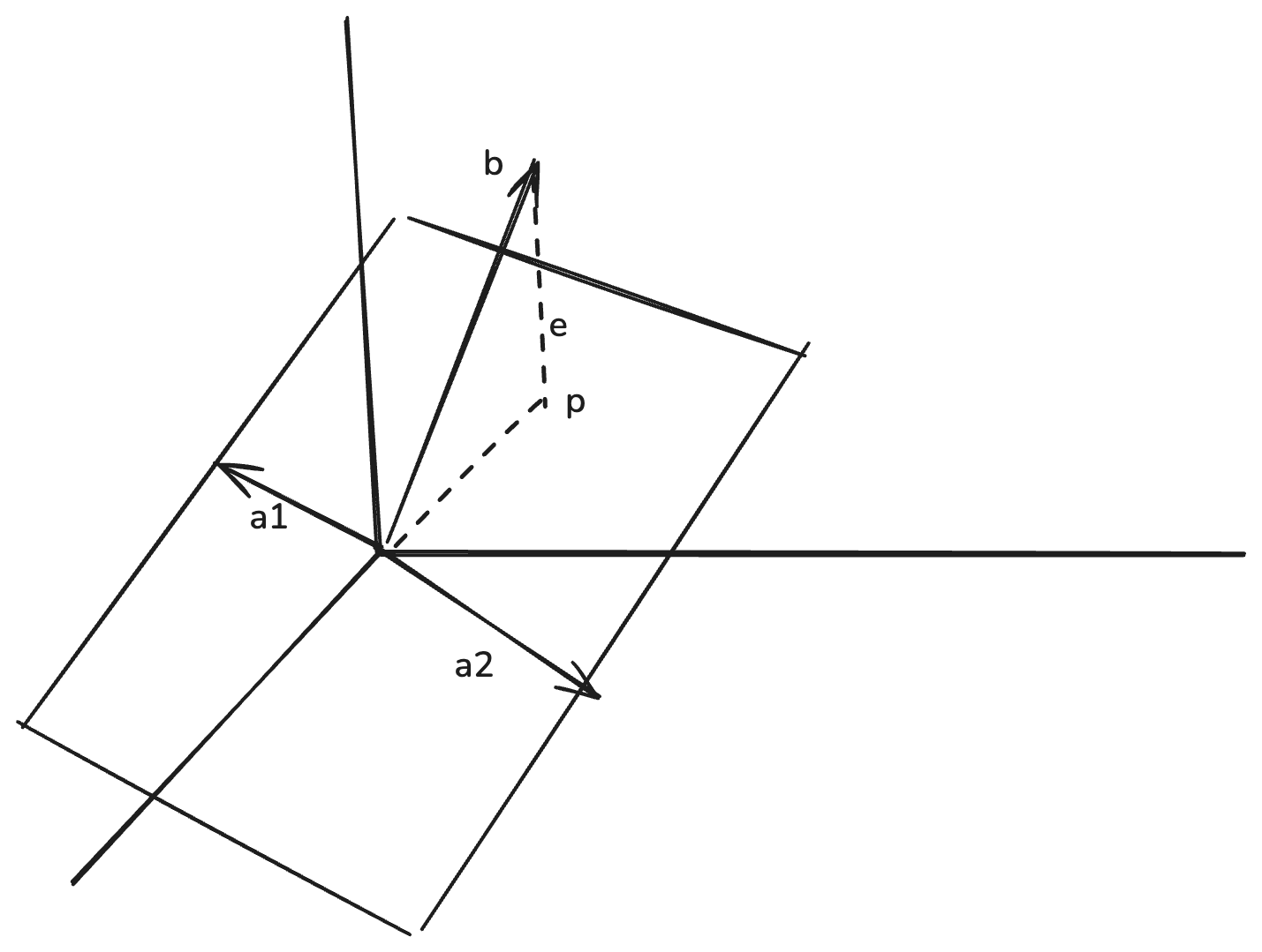 The error \(e = b - p\) is perpendicular to the plane (spanned by \(a_1\) and \(a_2\)).