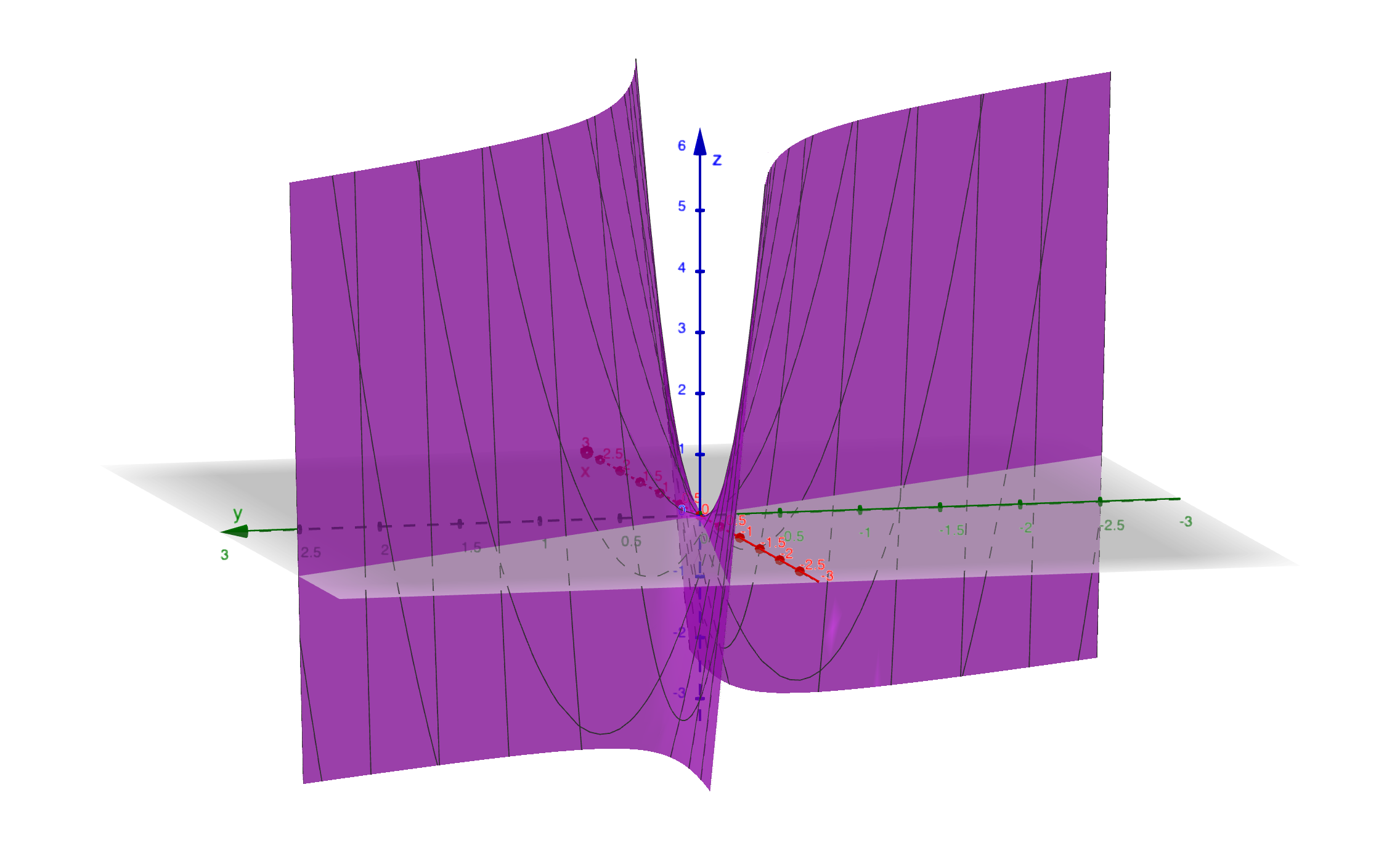 Geometric interpretation: The surface is a hyperbolic paraboloid (saddle). At the critical point, first-order derivatives are zero, but the function has no minimum—it goes up in some directions and down in others.
