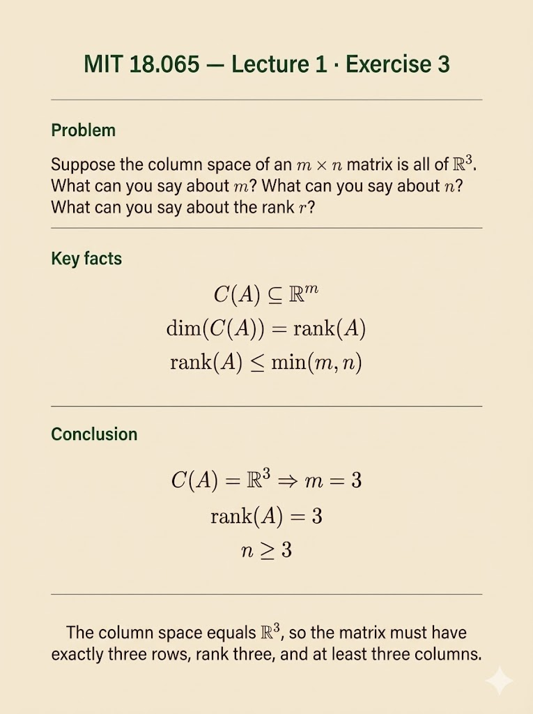 If the column space of an \(m \times n\) matrix is all of \(\mathbb{R}^3\), what can you say about \(m\), \(n\), and the rank?