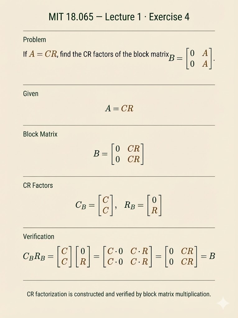 If \(A=CR\), find the CR factors of \[ B=\begin{bmatrix}0 & A\\ 0 & A\end{bmatrix}. \]