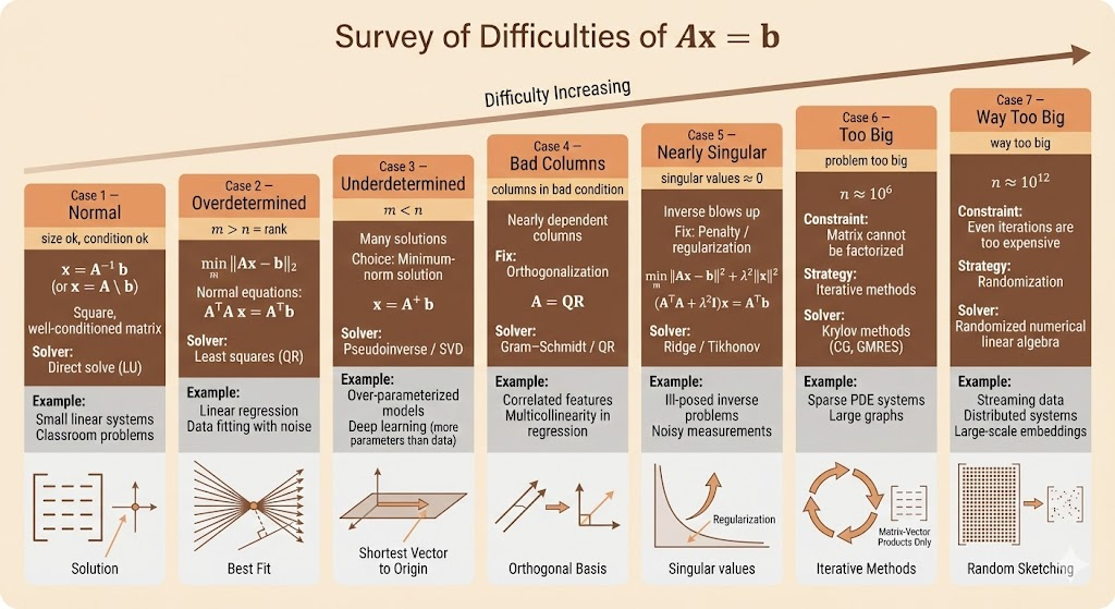 | Overdetermined | \(m > n, \mathrm{rank}(A)=n\) | No exact solution | Least-squares solution | Minimizes ||Ax - b||_2 |