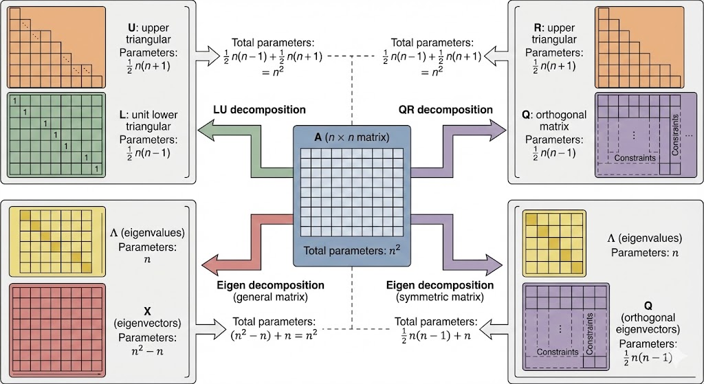 A general \(n\times n\) matrix has \(n^2\) free parameters. Each factorization splits those degrees of freedom across structured factors.