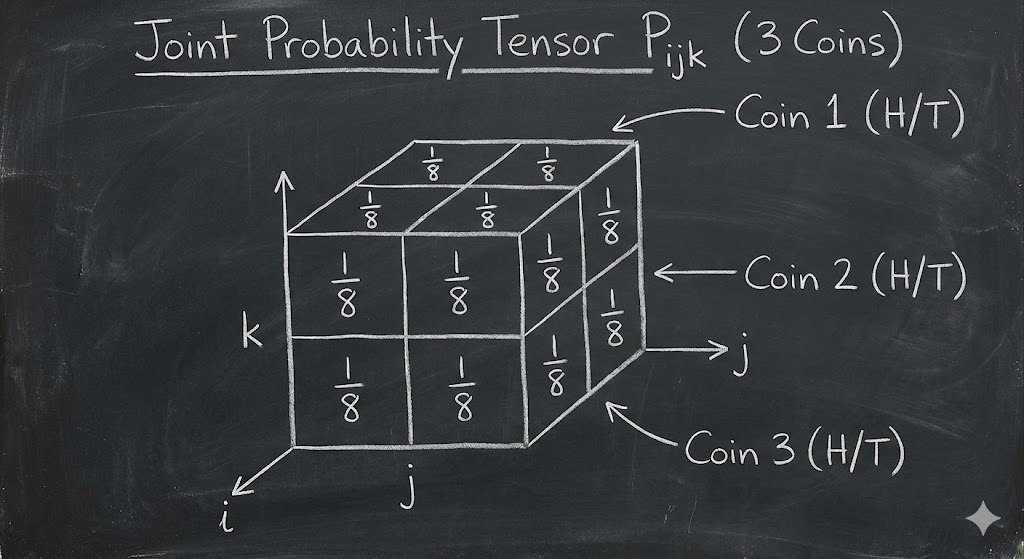 For three random variables, the joint distribution is a third-order tensor: \[ P_{ijk}=\Pr(X_1=i,X_2=j,X_3=k). \]