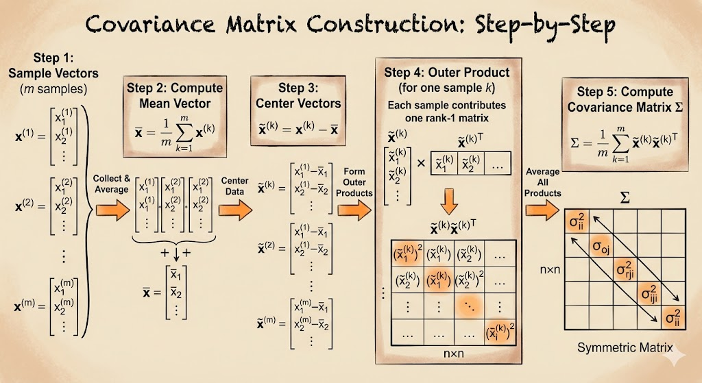 Let \[ X=\begin{bmatrix}X_1\\X_2\\ \vdots \\X_n\end{bmatrix},\qquad \mu=E[X]. \] The covariance matrix is \[ V=E[(X-\mu)(X-\mu)^\top] =\sum_k p_k (x_k-\mu)(x_k-\mu)^\top. \] Element-wise: \[ V_{ij}=\mathrm{Cov}(X_i,X_j)=E[(X_i-\mu_i)(X_j-\mu_j)]. \]