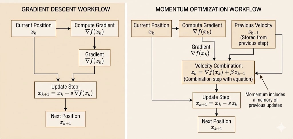 Momentum adds memory: \[ z_k=\nabla f(x_k)+\beta z_{k-1},\qquad x_{k+1}=x_k-sz_k,\qquad 0\le\beta<1. \]