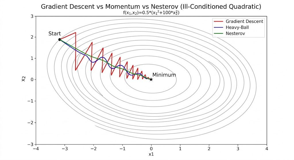 Takeaway. Momentum and Nesterov acceleration improve optimization by combining gradient information with velocity memory and look-ahead correction, replacing ()-limited behavior with ()-scaled dynamics in ill-conditioned landscapes.
