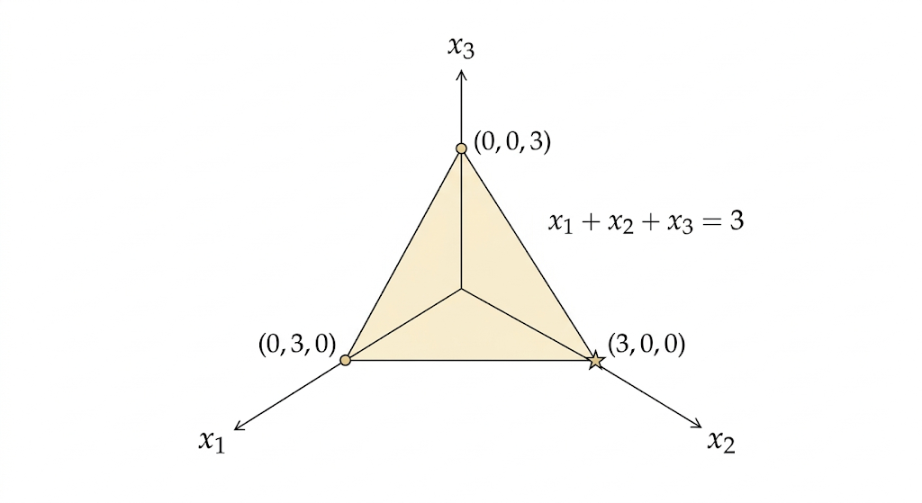 The equation \(x_1+x_2+x_3=3\) defines a plane. The nonnegativity constraint restricts us to the first octant. Their intersection is a triangle with vertices