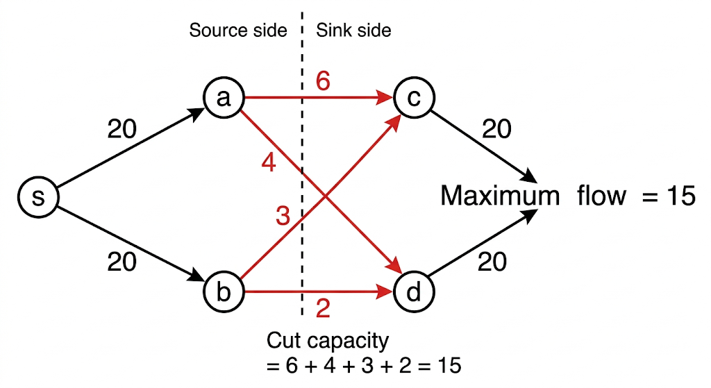 - The dual problem is min cut: find the smallest bottleneck separating source from sink.