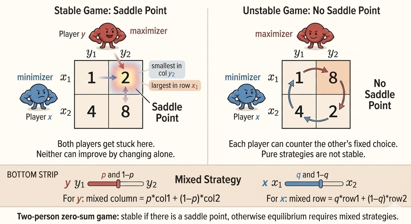 If a saddle point exists, pure strategies are enough. Otherwise both players randomize and use mixed strategies.