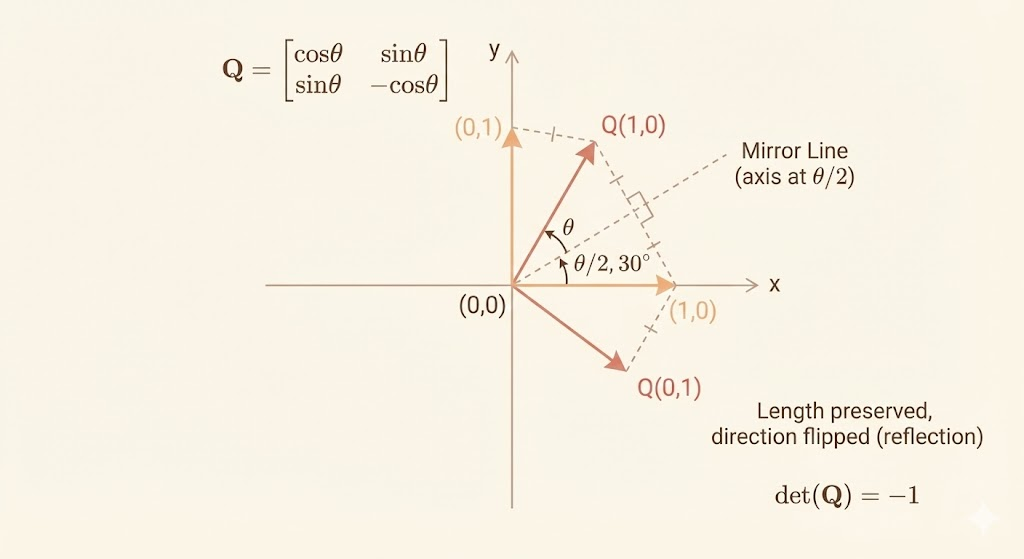 \[ Q=\begin{bmatrix}\cos \theta &\sin\theta \\\sin\theta &-\cos\theta\end{bmatrix} \]