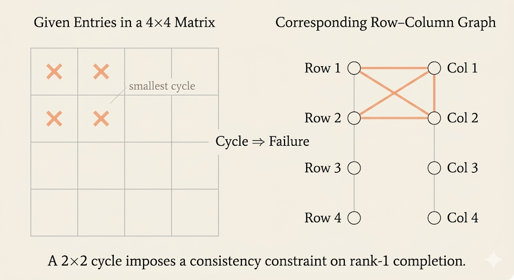 For example, a length-6 cycle inside a local \(3 \times 3\) region prescribes too many entries for a rank-1 structure. A \(3 \times 3\) rank-1 block only needs